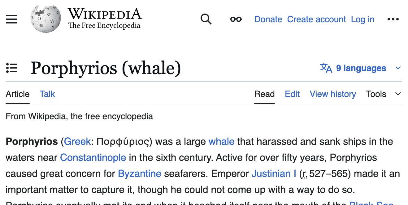 Procopius has this like incredible anecdote about this whale that terrorized the seas and harbors and ferries around Constantinople for what he says is about 50 years. This whale, this OG sea monster was named Porphyrios.